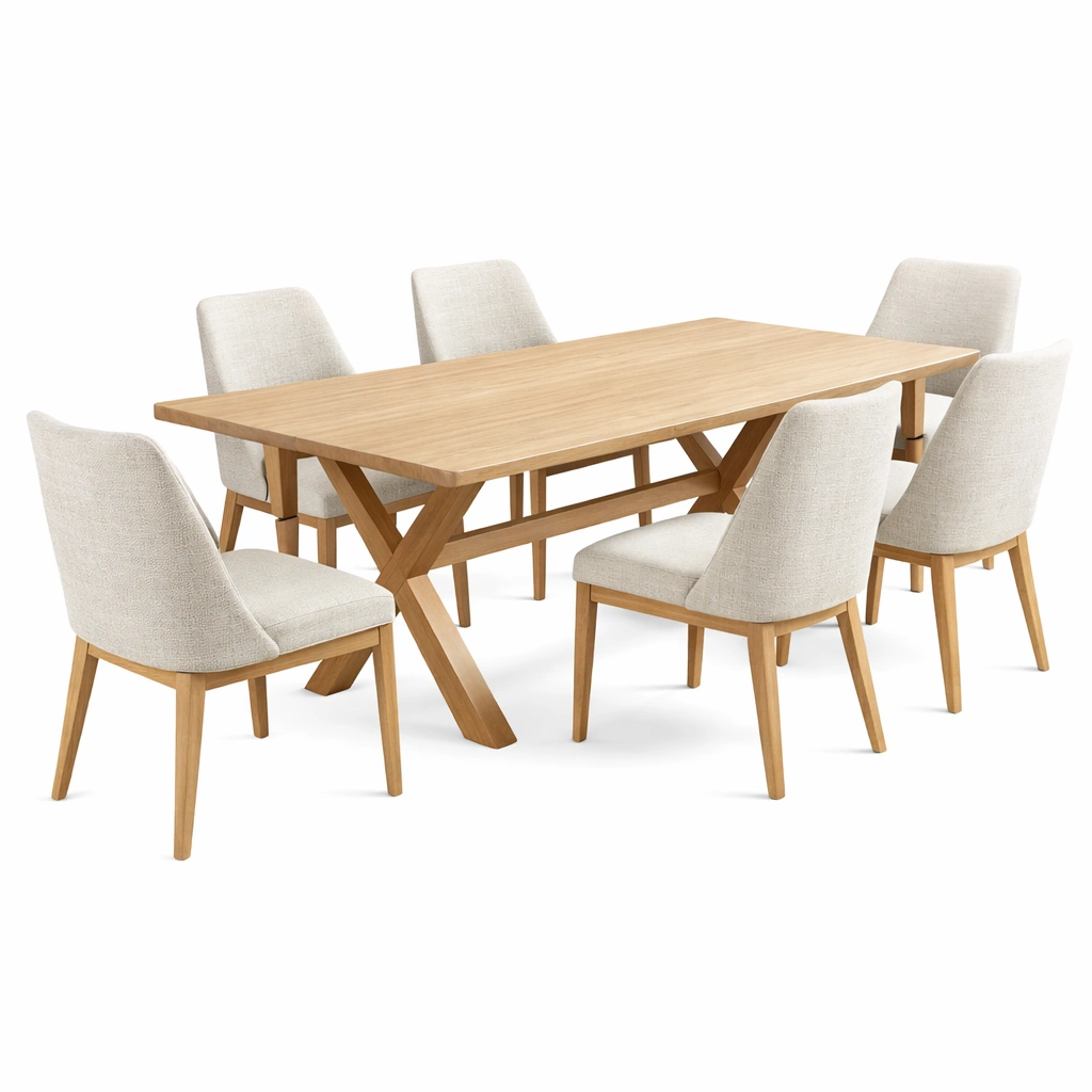 Essgruppe Eichenholz und Polyester Gewebe Beige mit 6 Stühlen