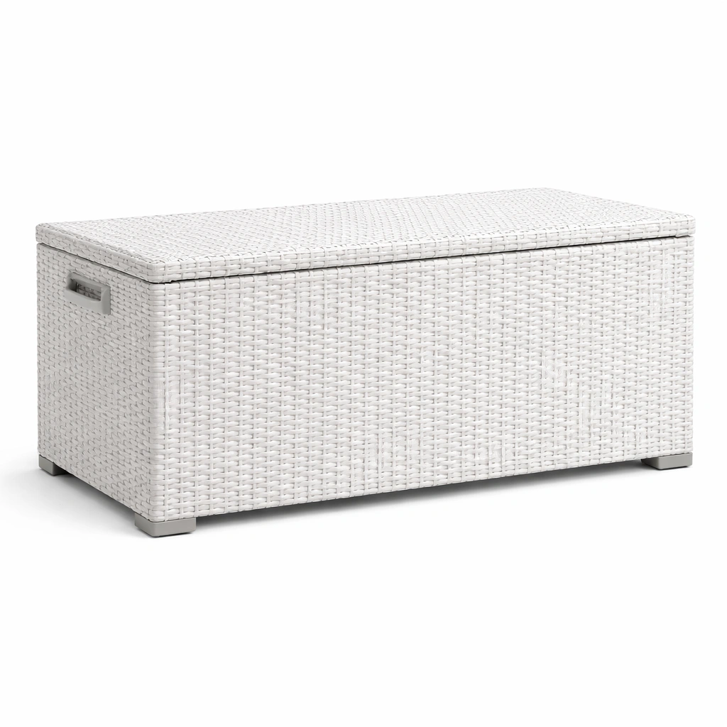 Das Produkt ist in Weiß gehalten und verfügt über Griffe für einfachen Transport. Sie ist UV- und wasserbeständig, um den Inhalt im Außenbereich zu schützen.