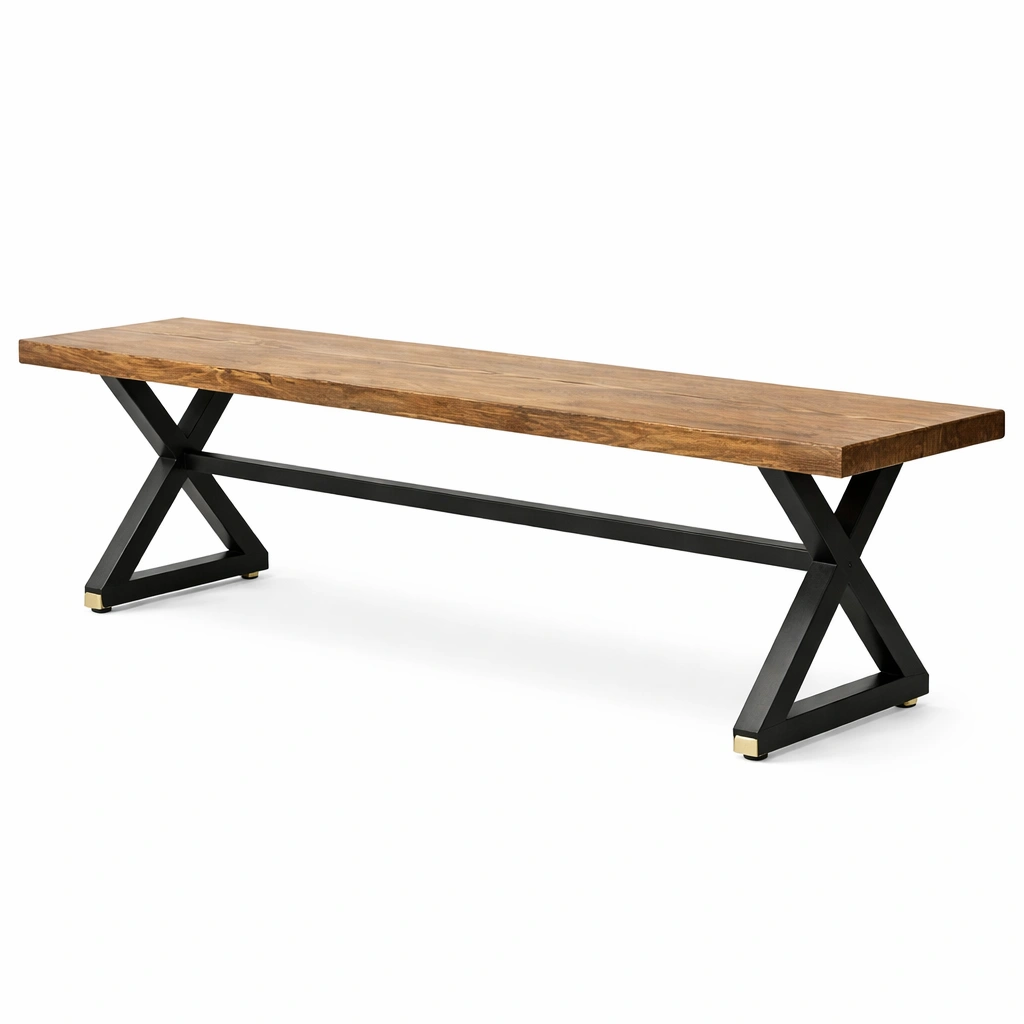 Diese Bank besteht aus massivem Akazienholz und einem stabilen Metallgestell. Die Abmessungen betragen 160 cm in der Länge, 40 cm in der Breite und 45 cm in der Höhe. Die Oberflächen sind naturbelassenes Holz und schwarzes Metall.