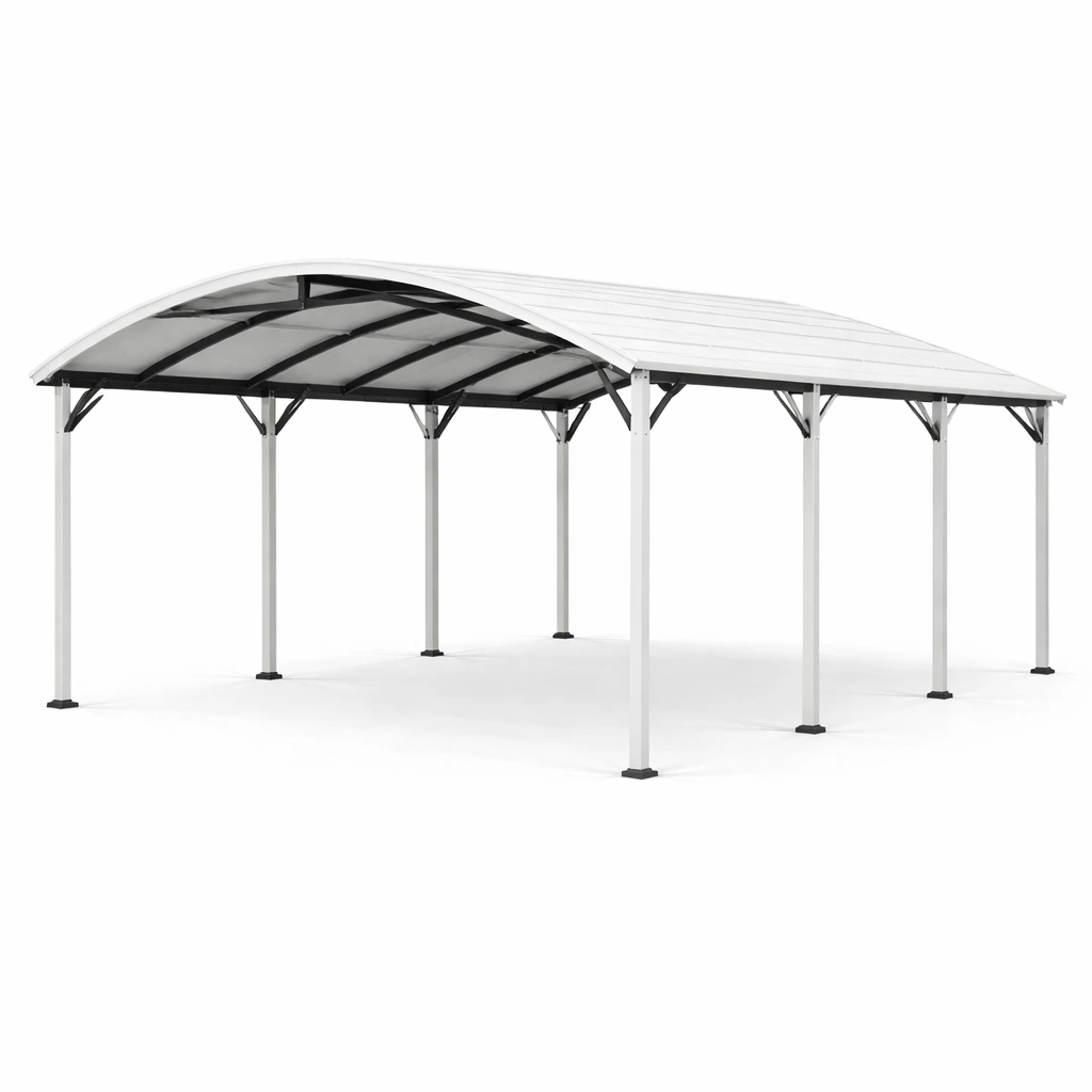 Diese Carport-Überdachung besteht aus robustem Aluminium und einem Dach aus 6 mm starkem Polycarbonat. Die Maße betragen 600 cm in der Länge, 300 cm in der Breite und 200 cm in der Höhe. Das Design ist bogenförmig und wird von 8 Aluminiumsäulen unterstützt. Es bietet UV-Schutz und Wasserdichtigkeit.